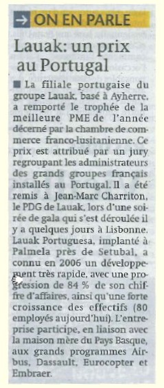 La filiale portugaise du groupe Lauak, basé à Ayherre, a remporté le trophée de la meilleure PME de l’année décerné par la chambre de commerce franco-lusitanienne. Ce prix est attribué par un jury regroupant les administrateurs des grands groupes français installés au Portugal. Il a été remis à Jean-Marc Charritton, le PDG de Lauak, lors d’une soirée de gala qui s’est déroulée il y a quelques jours à Lisbonne. Lauak Portuguesa, implanté à Palmela près de Setubal, a connu en 2006 un développement très rapide, avec une progression de 84% de son chiffre d’affaires, ainsi qu’une forte croissance des effectifs (80 employés aujourd’hui). L’entreprise participe, en liaison avec la maison mère au Pays basque, aux grands programmes Airbus, Dassault, Eurocopter et Embraer.