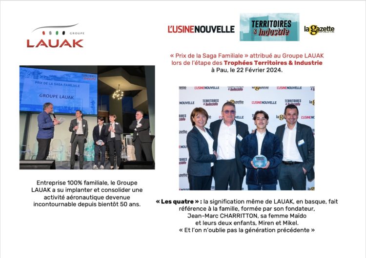 « Prix de la Saga Familiale » attribué au Groupe LAUAK lors de l’étape des Trophées Territoires & Industrie à Pau, le 22 Février 2024.